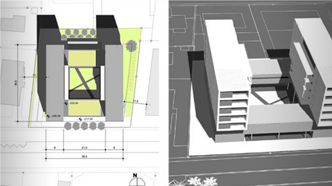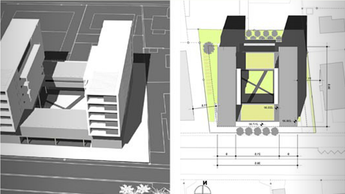 Il fulcro del centro é il giardino: un’area verde urbana a carattere pubblico o semipubblico, sul quale si rivolgono i due volumi laterali degli appartamenti.